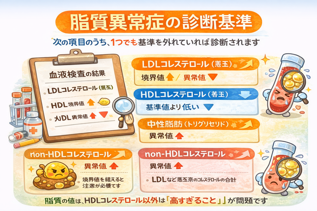 健康診断などで行う血液検査の結果をもとに、以下の4つの項目のうち1つでも基準を外れていれば脂質異常症と診断されます。